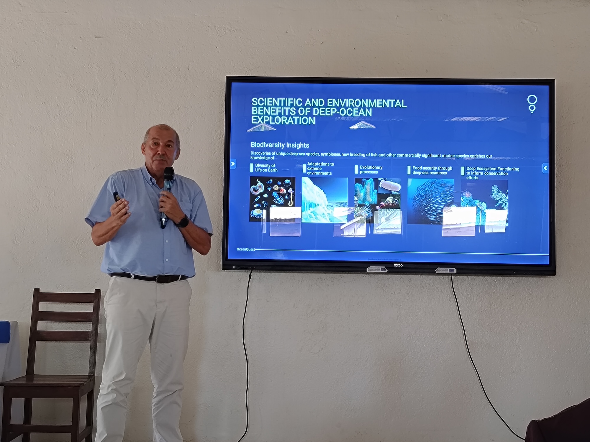 Special attention was given to the capabilities offered by the research vessel OceanXplorer, one of the most modern and sophisticated oceanographic research vessels in the world. Measuring 87 meters in length, the vessel is equipped with two manned submersibles, each capable of carrying three people—including researchers—to depths of approximately 1,000 meters, as well as remotely operated vehicles (ROVs) designed for deep-sea exploration and a helicopter for megafauna studies. The vessel also hosts state-of-the-art onboard laboratories, notably for environmental DNA (eDNA) analysis, and a dedicated media platform for education and the dissemination of scientific knowledge to the public and decision-makers. OceanXplorer focuses primarily on the deep ocean, the least explored regions of the world’s seas.