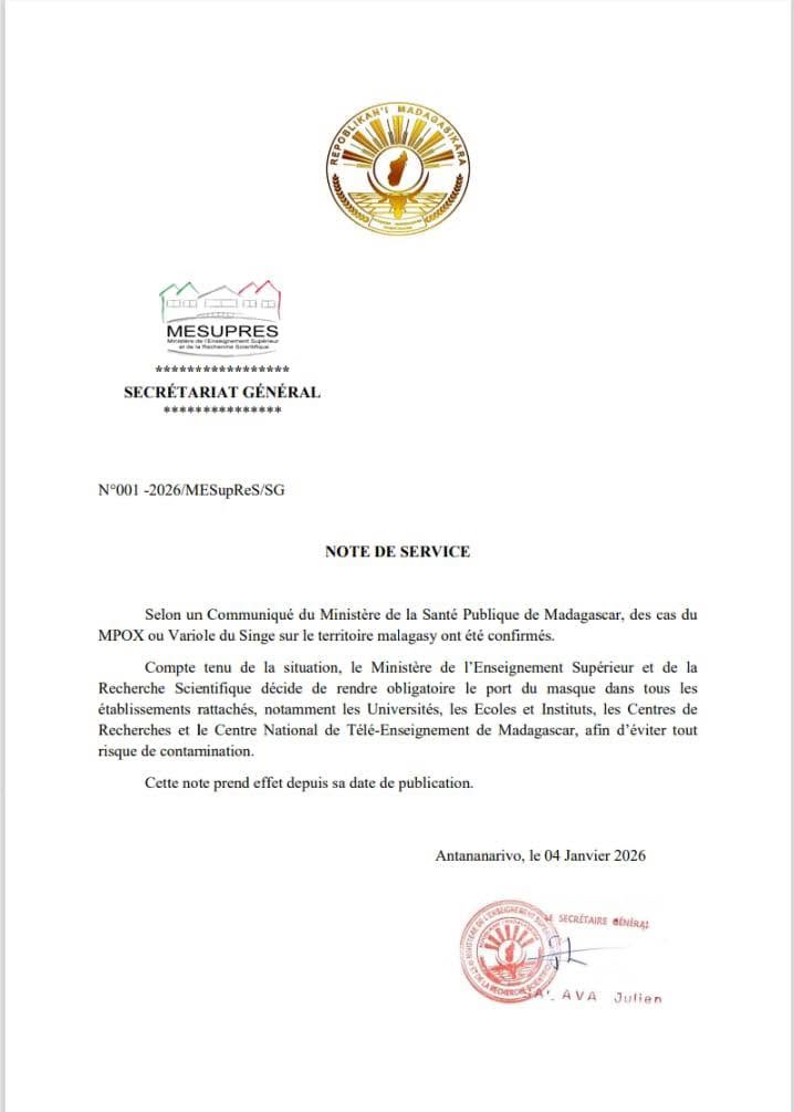 Compte tenu de la situation, le Ministère de l’Enseignement Supérieur et de la Recherche Scientifique décide de rendre obligatoire le port du masque dans tous les établissements rattachés, notamment les Universités, les Écoles et Instituts, les Centres de Recherches et le Centre National de Télé-Enseignement de Madagascar, afin d’éviter tout risque de contamination.
